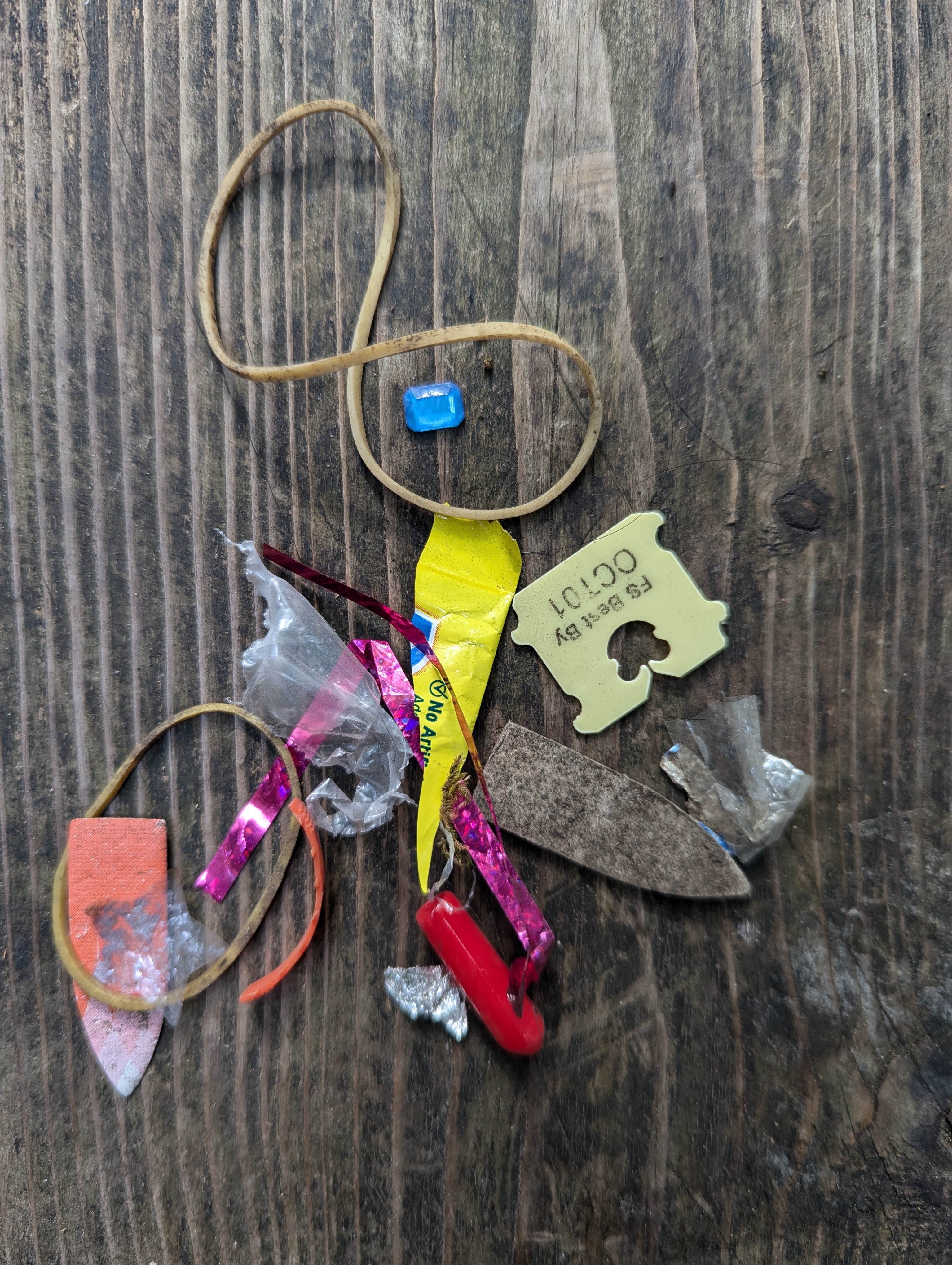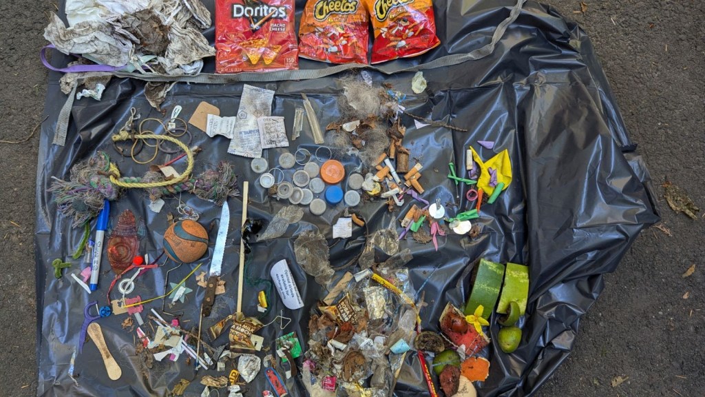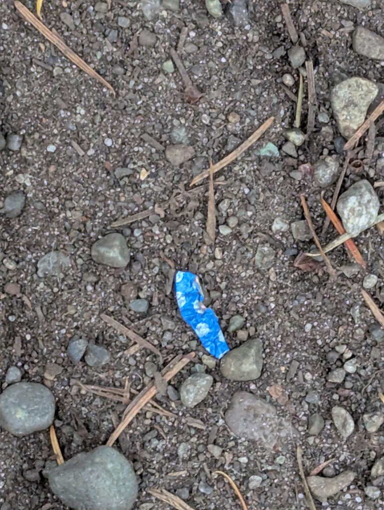 Bright and shiny, just waiting for a little critter to investigate and choke on. Perfectly normal to find chip bags, juice pouches and their clear straw wrappers, mini candy bar wrappers, CORNERS of any torn off package, wire bread ties, square plastic bread fasteners, batteries, paper clips (old school office work in the woods, I guess?), Hershey’s Kiss and other candy foils, couch cushions and a Big Wheel thrown into the woods, dog toys, at least five footballs so far, bottles (glass and plastic), cans, cellophane from a fresh package of cigarettes (I’ll just toss it in the ferns, makes sense)….