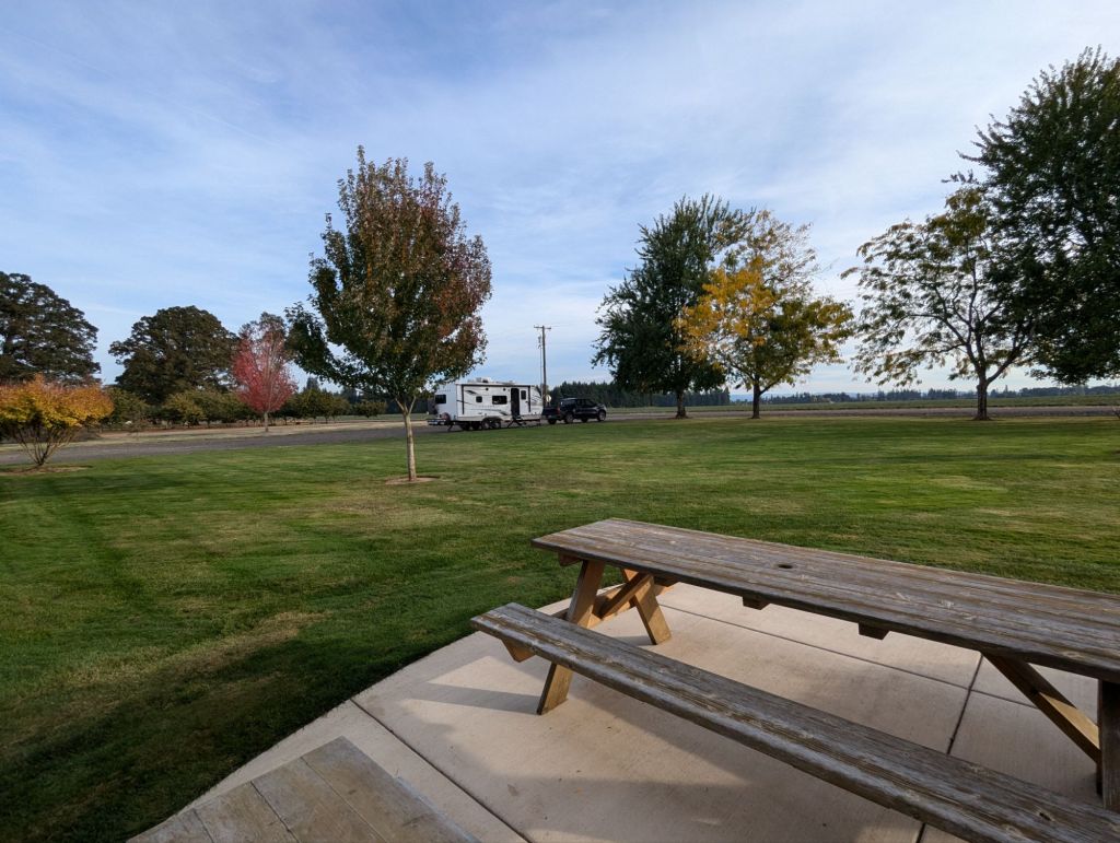 A few nights ago we boondocked at a hazelnut farm run by a lovely couple who have created a charming environment for campers complete with a covered pavilion. We were greeted with a welcome bag containing roasted hazelnuts and hazelnut cookies! Once we discovered the hazelnut pie and chocolate-covered hazelnuts for purchase, we were happy to part with any cash we had.