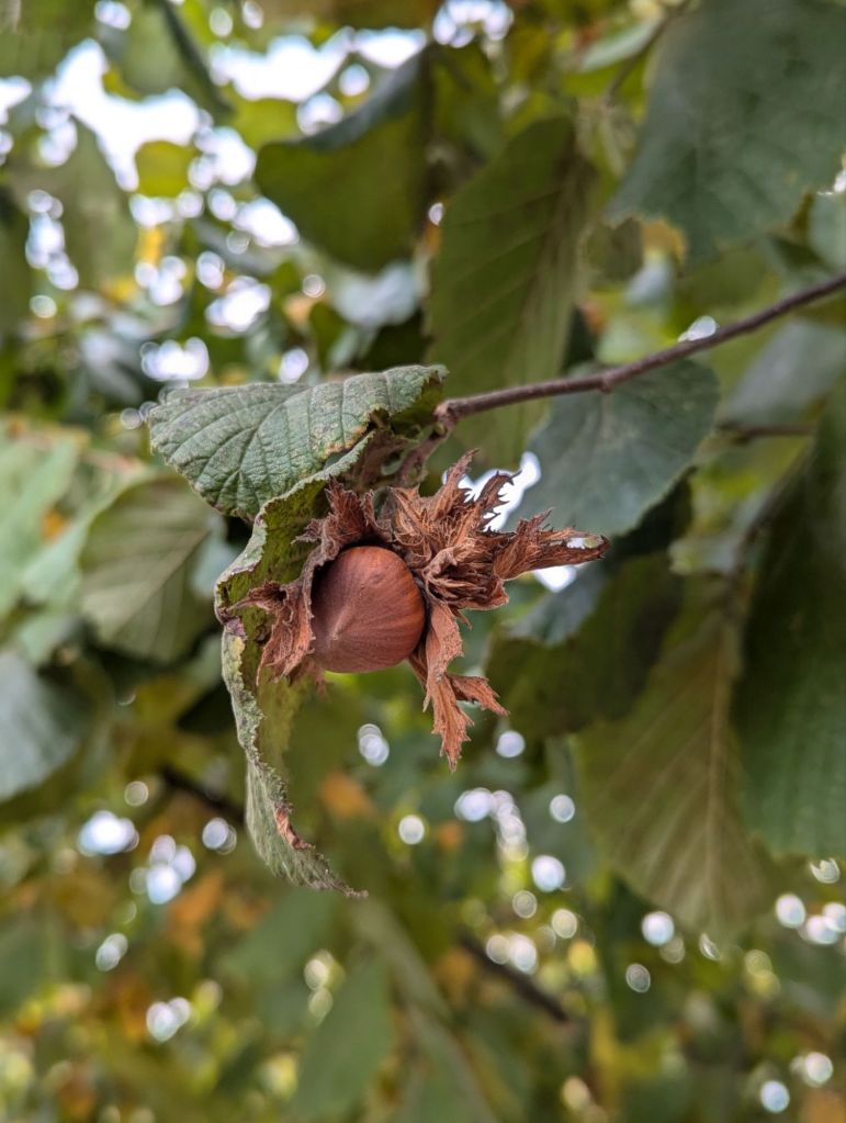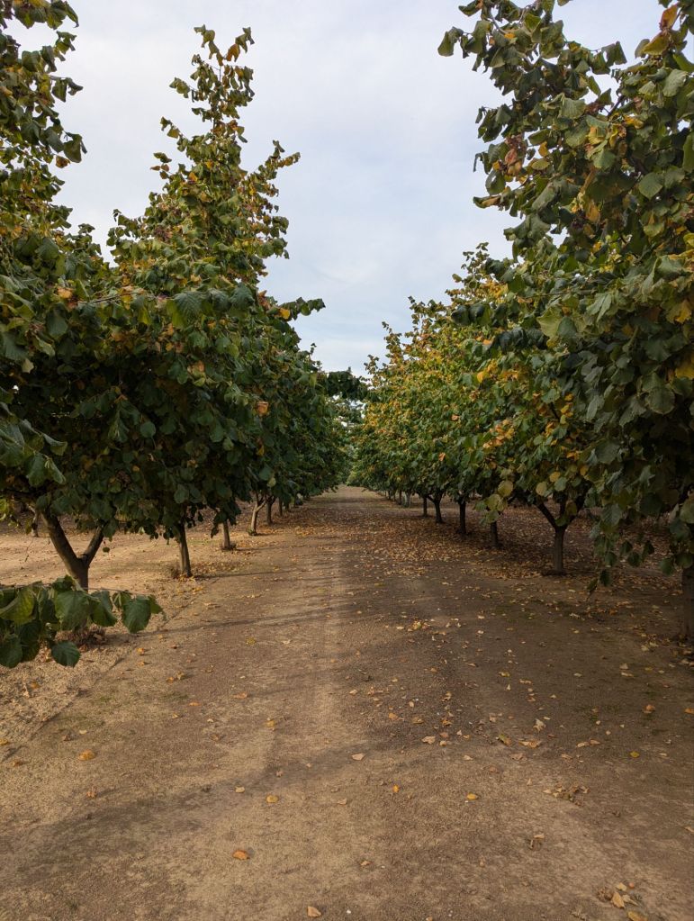 We camped with neat rows of hazelnut trees all around and acquired a very basic understanding of hazelnut harvesting. Greg grew up where giant machines would shake the pecans out of trees for harvest. Hazelnuts do not require such force. The hazelnuts drop when they are ready, and nearly all at once! They told us that they usually drop in two separate batches.