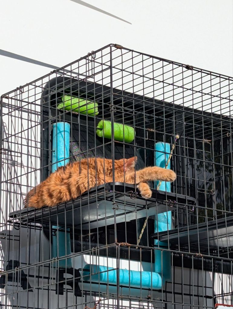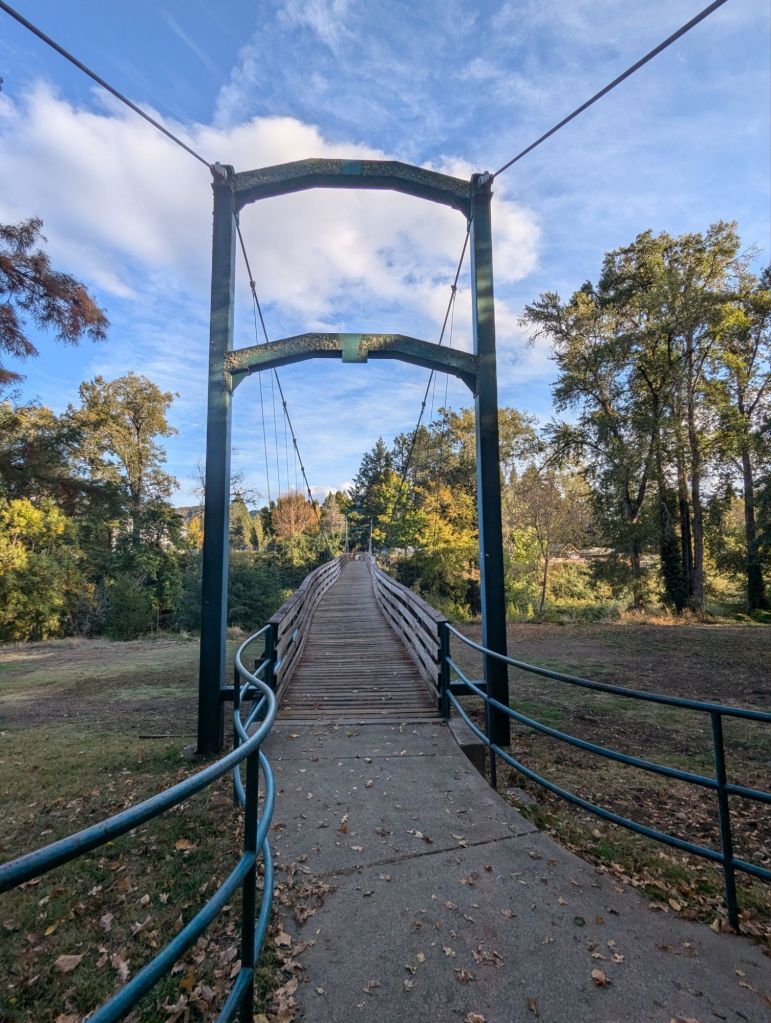Take the 5 to Exit 45B…(Uh, wuuuut are you doing here? If you know, you know). Exit the highway and you’re there. It used to be a rest area! The park is a narrow swath sandwiched between the Rogue River and I-5. It is surprisingly beautiful with lots of colorful trees, small mountains and nice walking trails. A little bit of highway noise, but that always reminds me of the ocean. Once we got set up, the catio and cats attracted a lot of attention from people walking by. Some were even taking photos of them!
