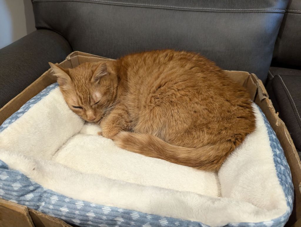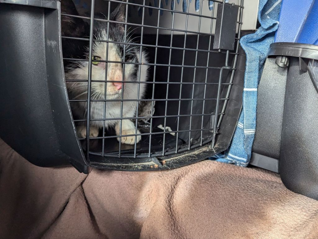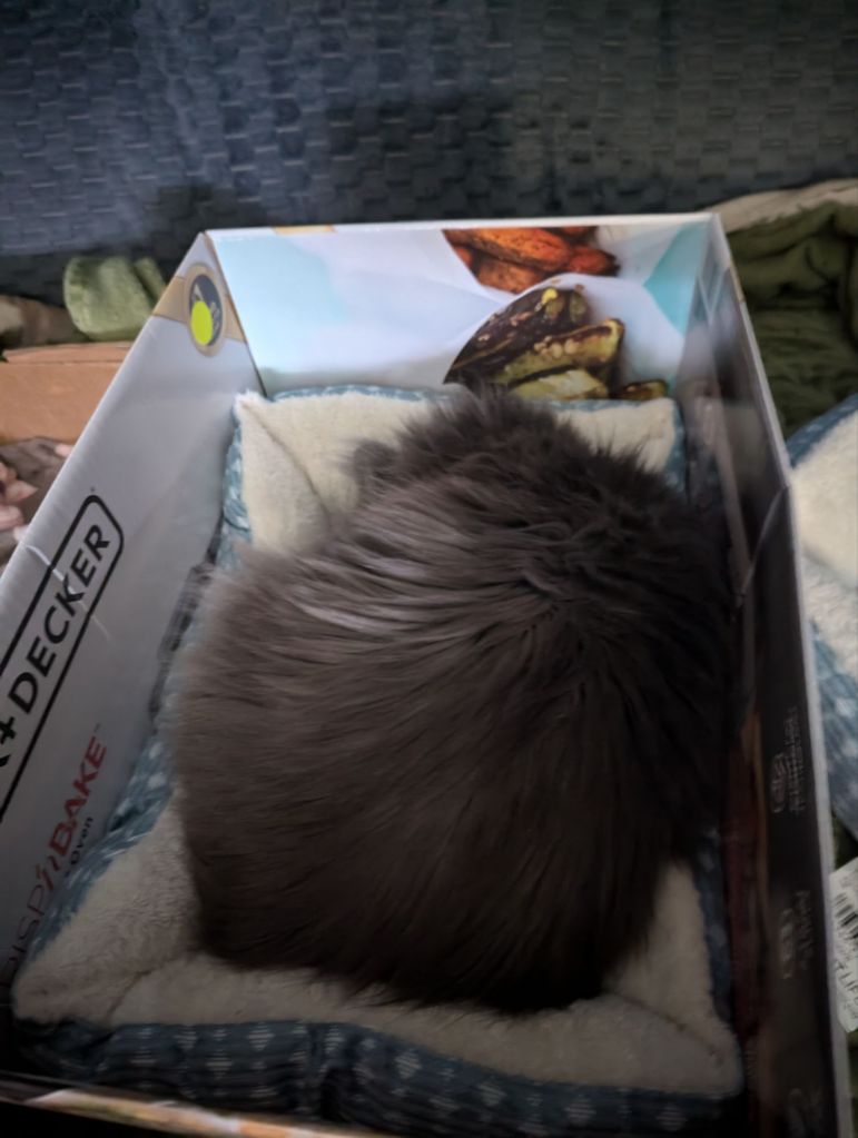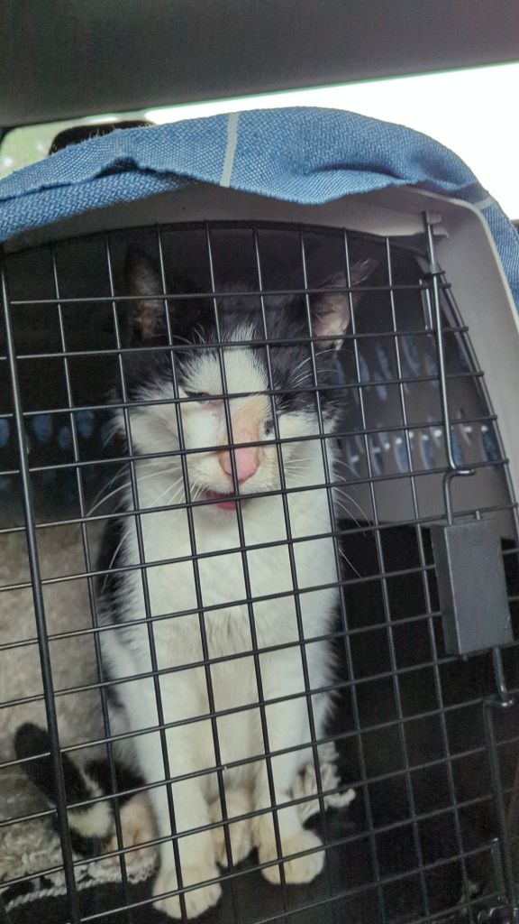 We were relieved when our humans successfully lured the black and white cat into (Cleo’s) carrier and took him to the shelter. No more howling under the trailer and worried looks on the humans’ faces. They said that he relaxed and started falling asleep on the way to the shelter. Probably hasn’t been warm in a very long time. We did feel badly for him, as long as he never planned on taking over our territory or eating our treats.