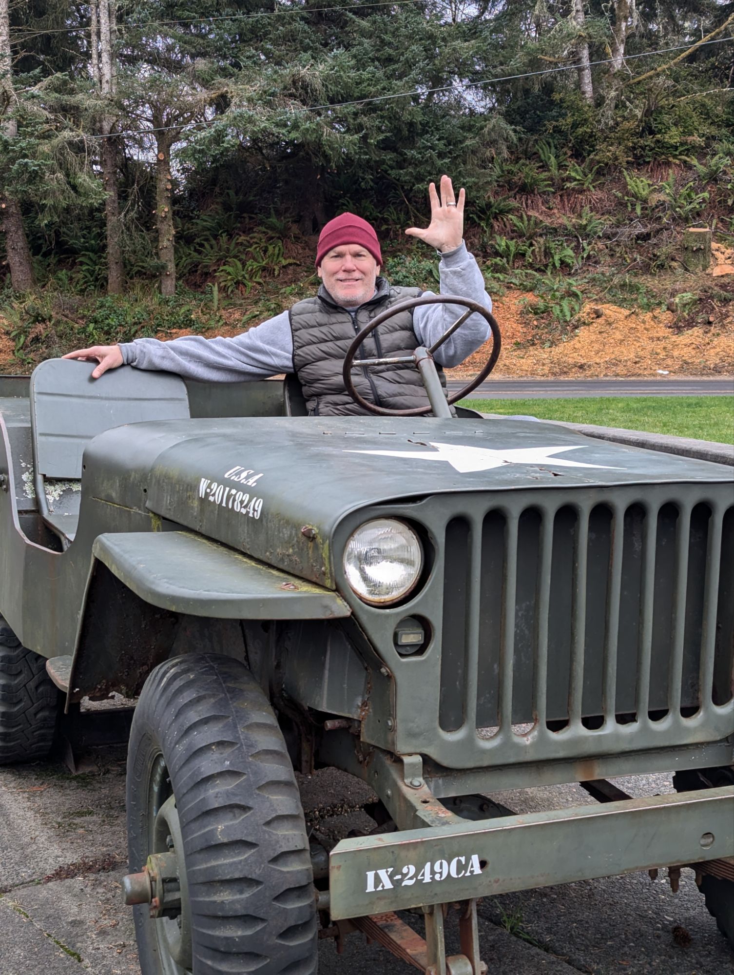Upon our arrival at Fort Stevens State Park we were greeted by a closed welcome center that had a military Jeep out front. Greg couldn’t resist sitting in it, of course.