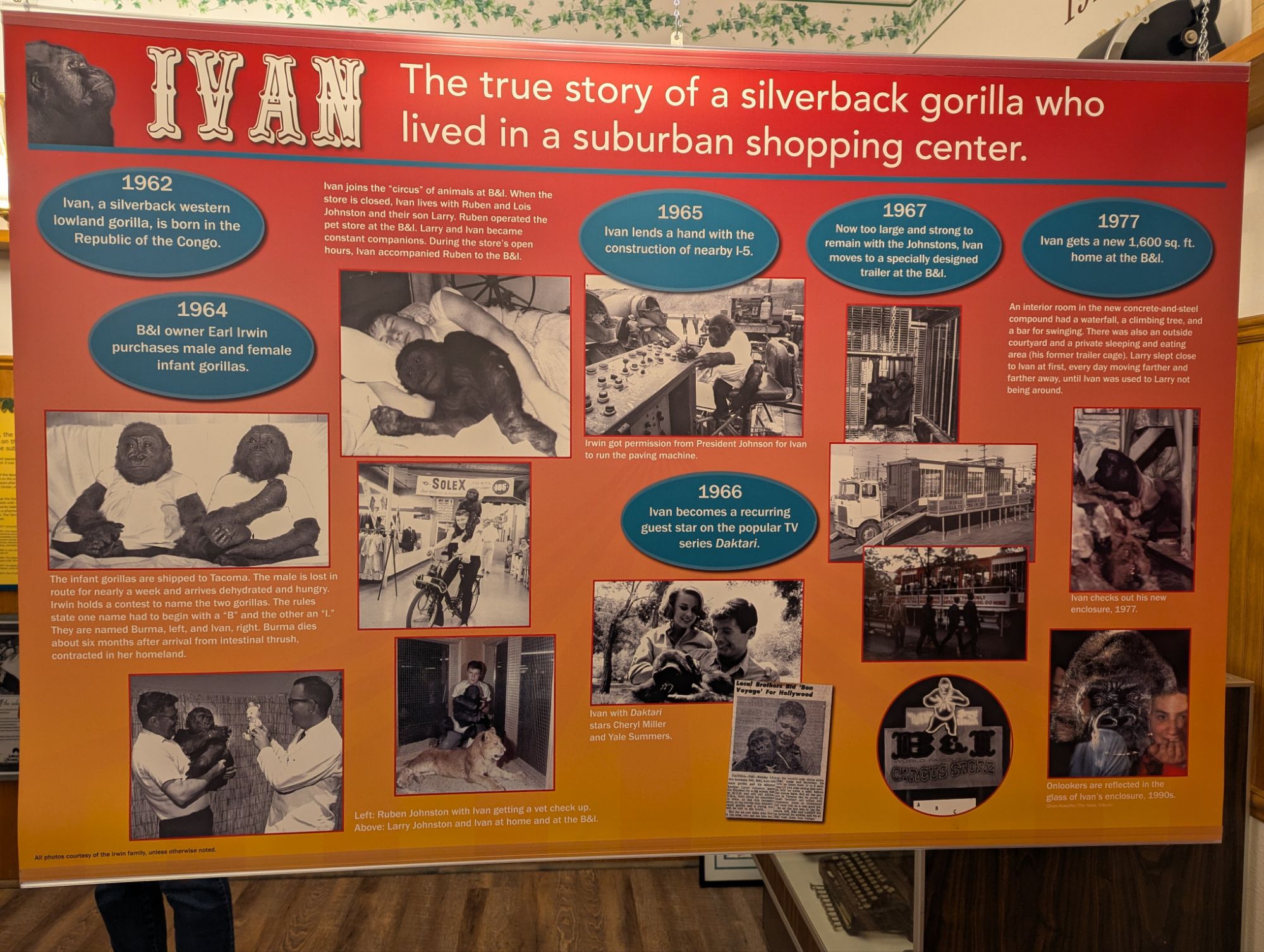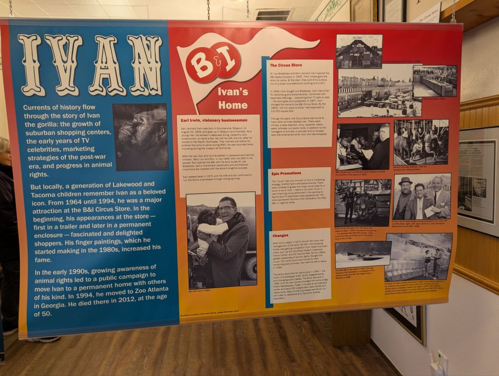 We learned about Ivan the Gorilla who was a pet and then kept in a cage at a store in Tacoma before being moved to the Atlanta Zoo. Many protests and negative publicity in the 90’s. Sad story.