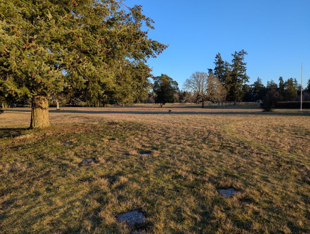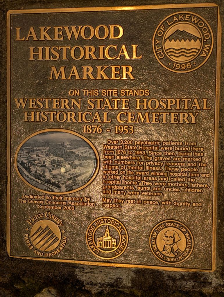 This cemetery is located on the grounds of Fort Steilacoom Park which was once a large farm run by the Western State Hospital and some of its patients. They grew crops, produced dairy, meat, canned goods and more. Now it it a park with a huge dog park, trails, birding, etc.