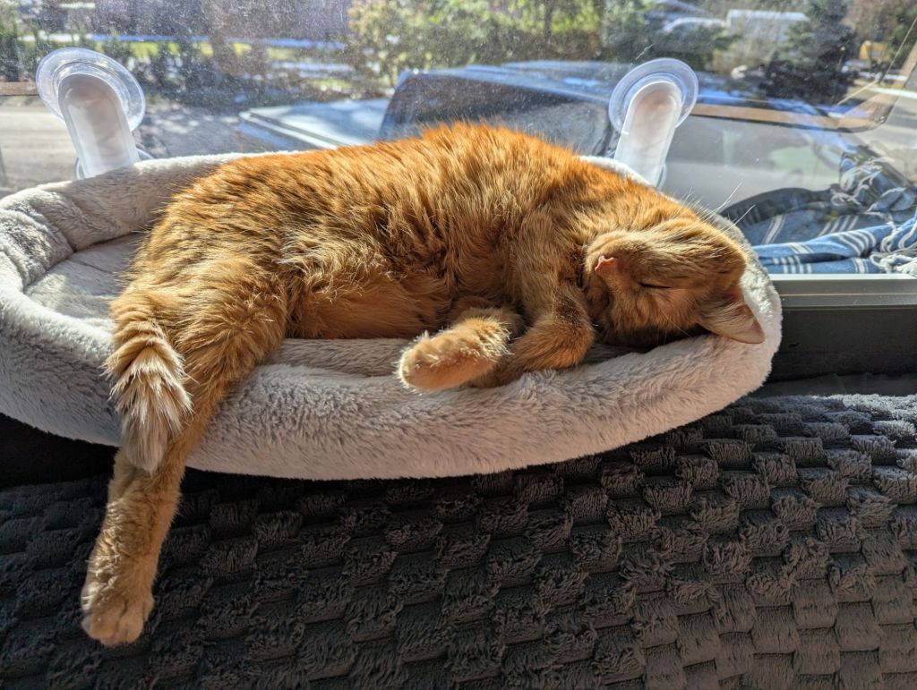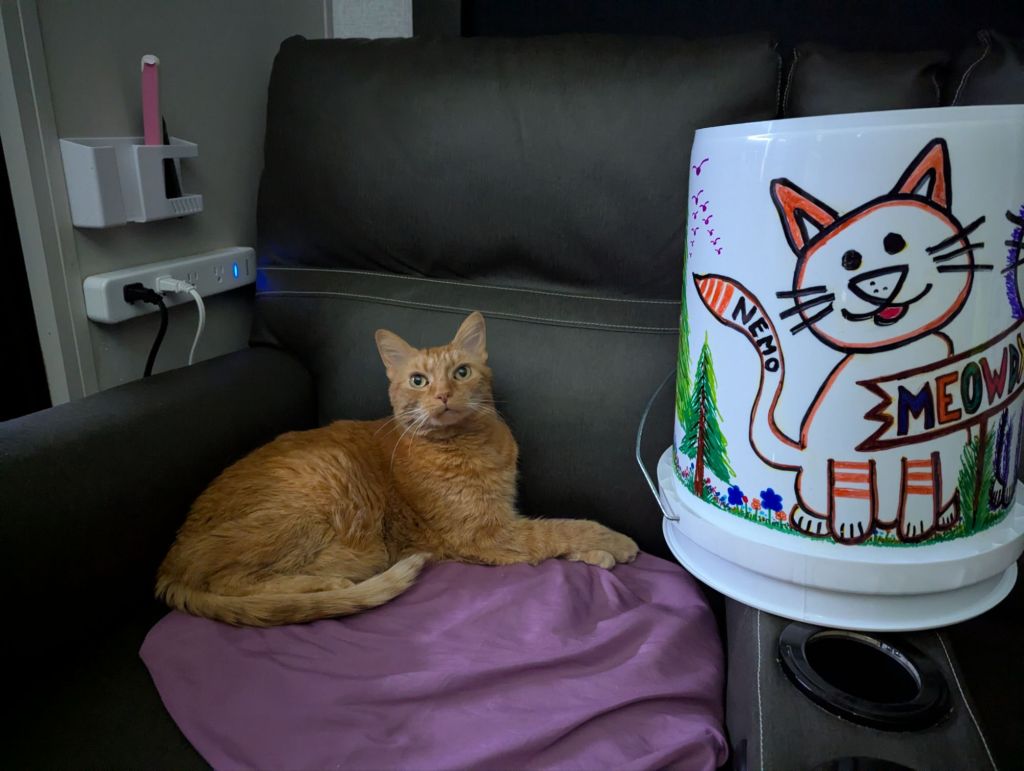 Finally, we greatly appreciate the camper being out of the trees and in the sunshine for the first time since October. How do you keep cats happy living in an RV? Nap spots, playtime, a catio and sunshine!
