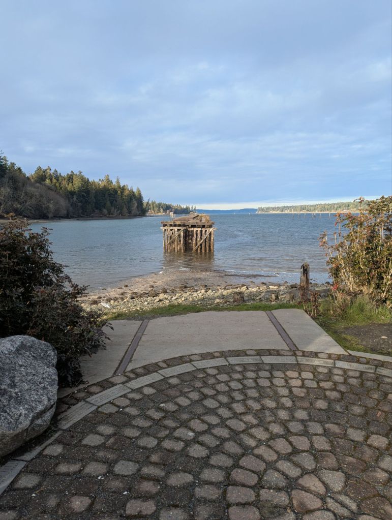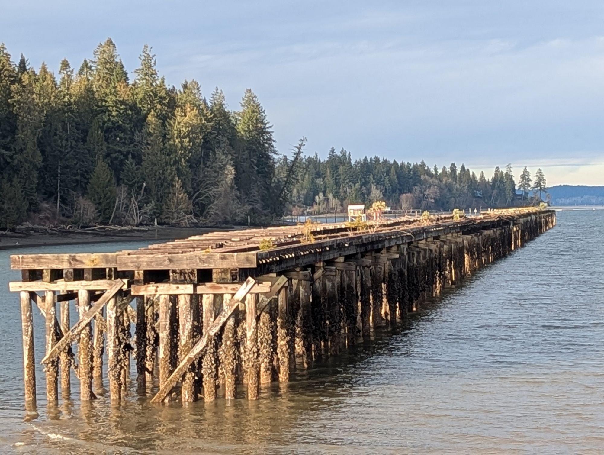 Logging trains once used this spot at Woodard Bay to dump logs into the water so that they could be easily transferred to rafts to be floated elsewhere. There is an interesting spot where you can stand and see where the tracks once led to the trestle which has since been partially dismantled.