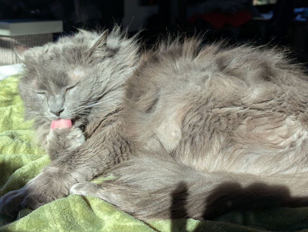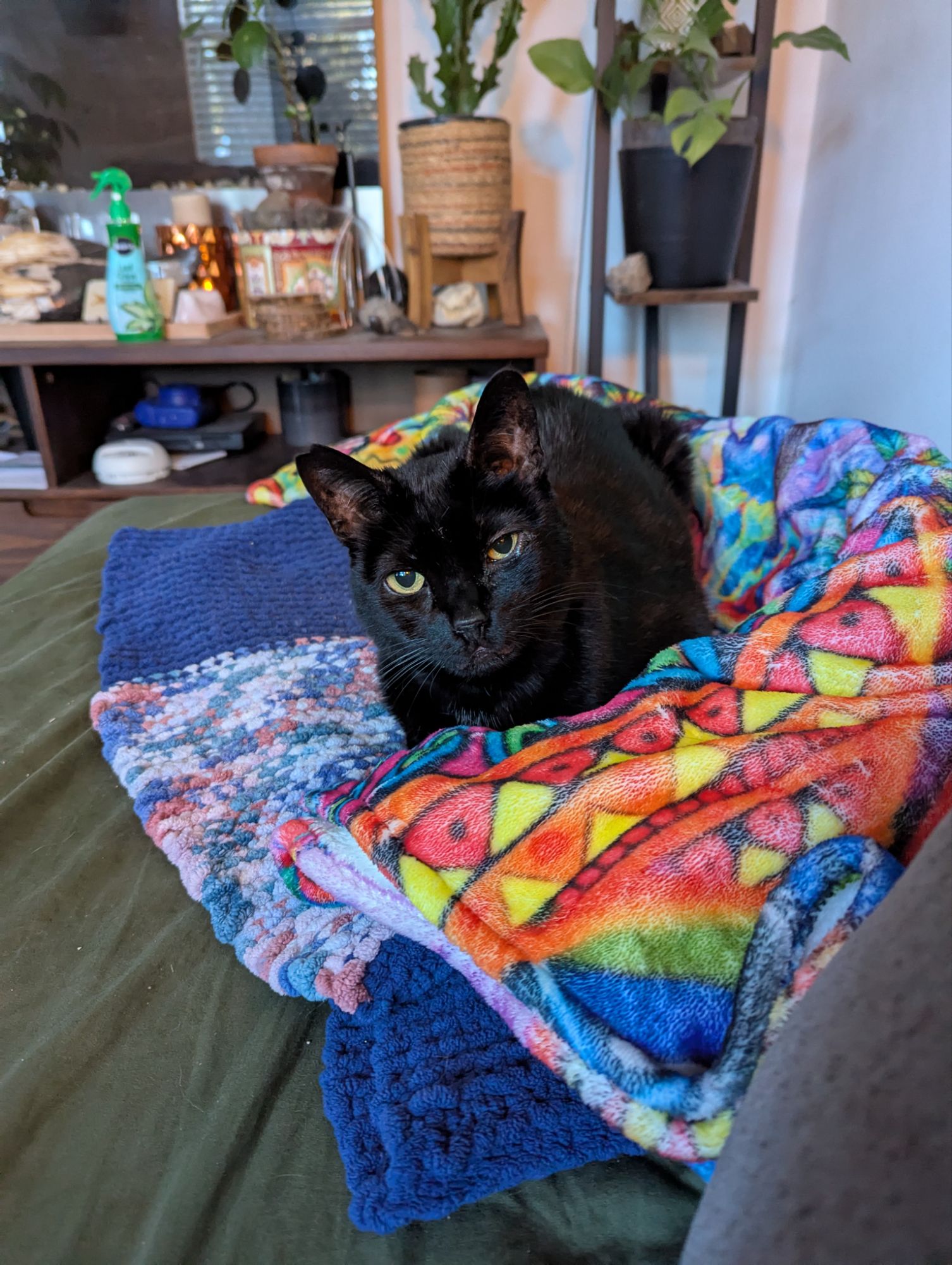 We are quite cozy while we cat sit Titan and Maui for about a week while their feeders and scoopers are on the east coast visiting family. Maui recently had oral surgery, so she’s not feeling her best. I am also having to manhandle her a bit to administer eye drops. Hopefully, she won’t hate me by the end of the week! Titan must be confused since she used to live in Columbus with us and probably thought she got rid of us forever when she flew here to live with Leslie and Anthony. Surprise, Titan!