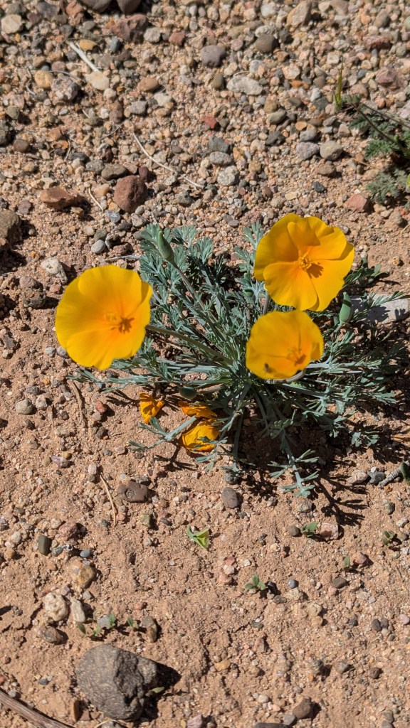 Good people, sunshine, early blooms, beautiful poppy in our campsite. That’s the thing, the poppy, happiness, contentedness, grateful, corny, sappy. Even the cats. I sure could use a good haircut, maybe in Vegas?